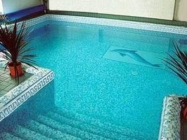 Brilantná ukážka skutočnosti, že niekedy sa dá urobiť aj „Za málo peňazí – Veľa muziky“. Aj takto môže vyzerať interiérový bazén obložený sklenenou mozaikou Direct Mosaic. Triezva kombinácia modrej miešanej mozaiky s modrobielym dekórom. Vodný svet v interiéri dokresľuje dekór – delfín. Len doň skočiť…