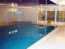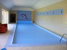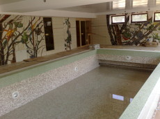 Bazén je situovaný v samostatnej bazénovej hale. Prezrime si riešenie objektu zhora dole. Stropu dominuje veľkoplošná reflexná fólia doplnená inšpiratívnym osvetlením bodovými svietidlami symbolizujúcim nočnú oblohu. Plocha stropu s benátskou stierkou je zdobená kruhovými dekórami. Reflexná fólia v kombinácii so zrkadlami vsadenými do obkladu vnútorných stien haly opticky zväčšuje už aj tak veľký priestor. Steny haly sú obložené luxusným lesklým obkladom zo série Starlight od renomovanej talianskej keramičky Tagina. Obklad je doplnený polstĺpmi, ktoré ešte viac odľahčujú neveľký optický tlak stropu. Priestor je teda ideálne riešený a pôsobí veľmi voľne. Bazénové hrany a odtokové mriežky sú plastové a samotná bazénová vaňa má fóliový povrch modrej farby. Bazén je doplnený halogénovým osvetlením pod hladinou, ktoré dokresľuje príjemný pocit z kúpania v tomto krásnom stavbárskom umeleckom diele.
